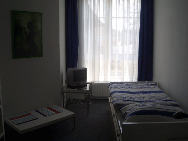 Vom kleinen möblierten Einbettzimmer (bzw. Zweibettzimmer) mit Waschbecken und Kühlschrank im Zimmer, Dusche/WC am Gang